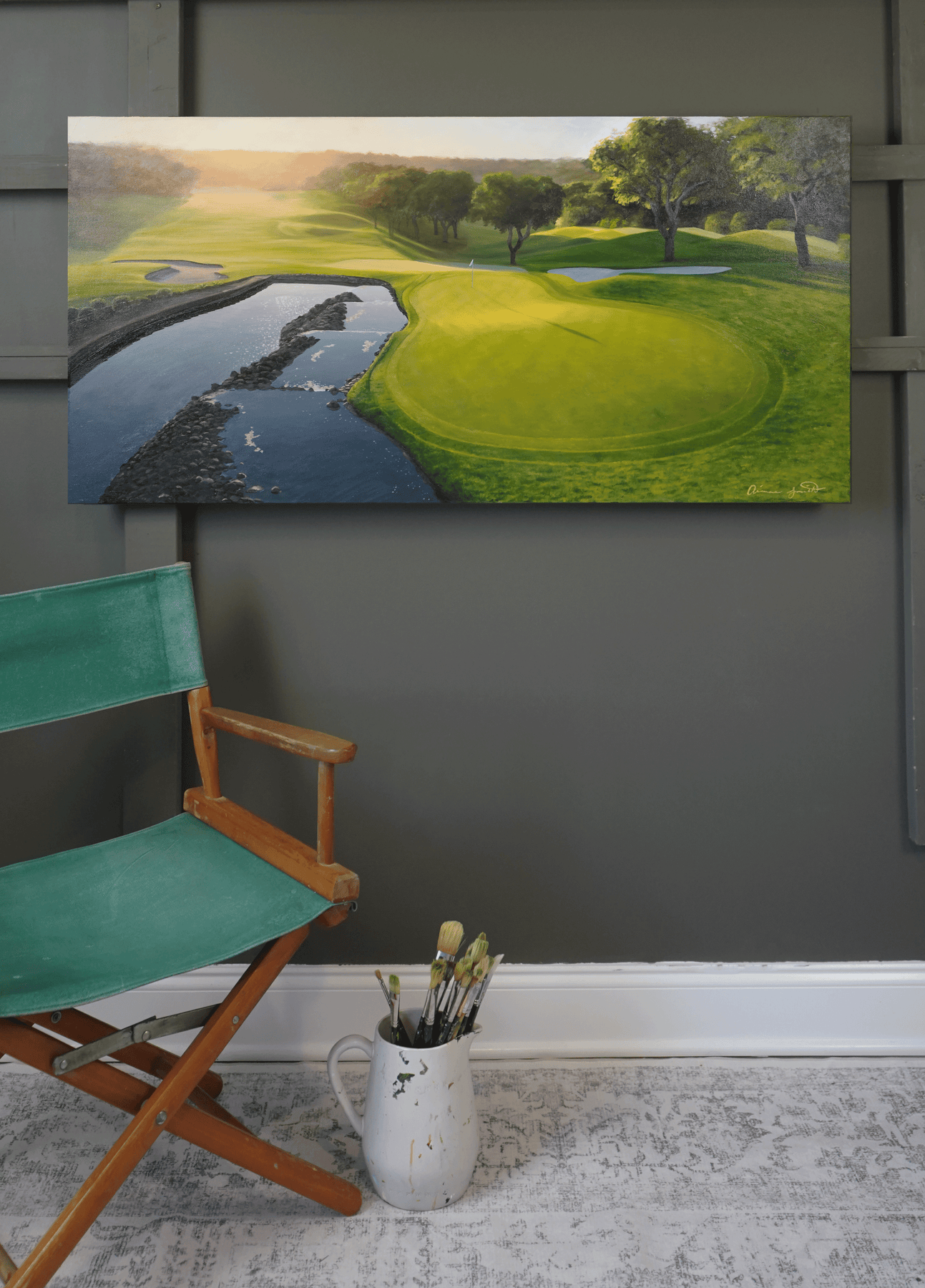 This original oil painting captures the 4th hole at Real Club Valderrama in Sotogrande, Spain, one of the most celebrated courses on the continent and longtime home of the Volvo Masters. Painted on canvas at 24" x 48", this piece brings the drama and elegance of Valderrama into your home or office.