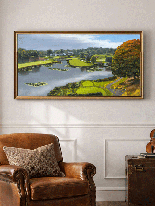 “Autumn at Scarsdale Golf Club” celebrates the course’s serene water features and iconic architecture, all bathed in warm autumn light. A timeless addition for any golfer or golf art collector.