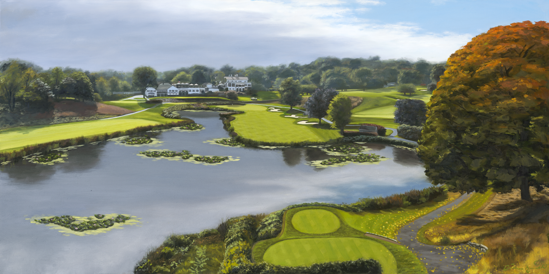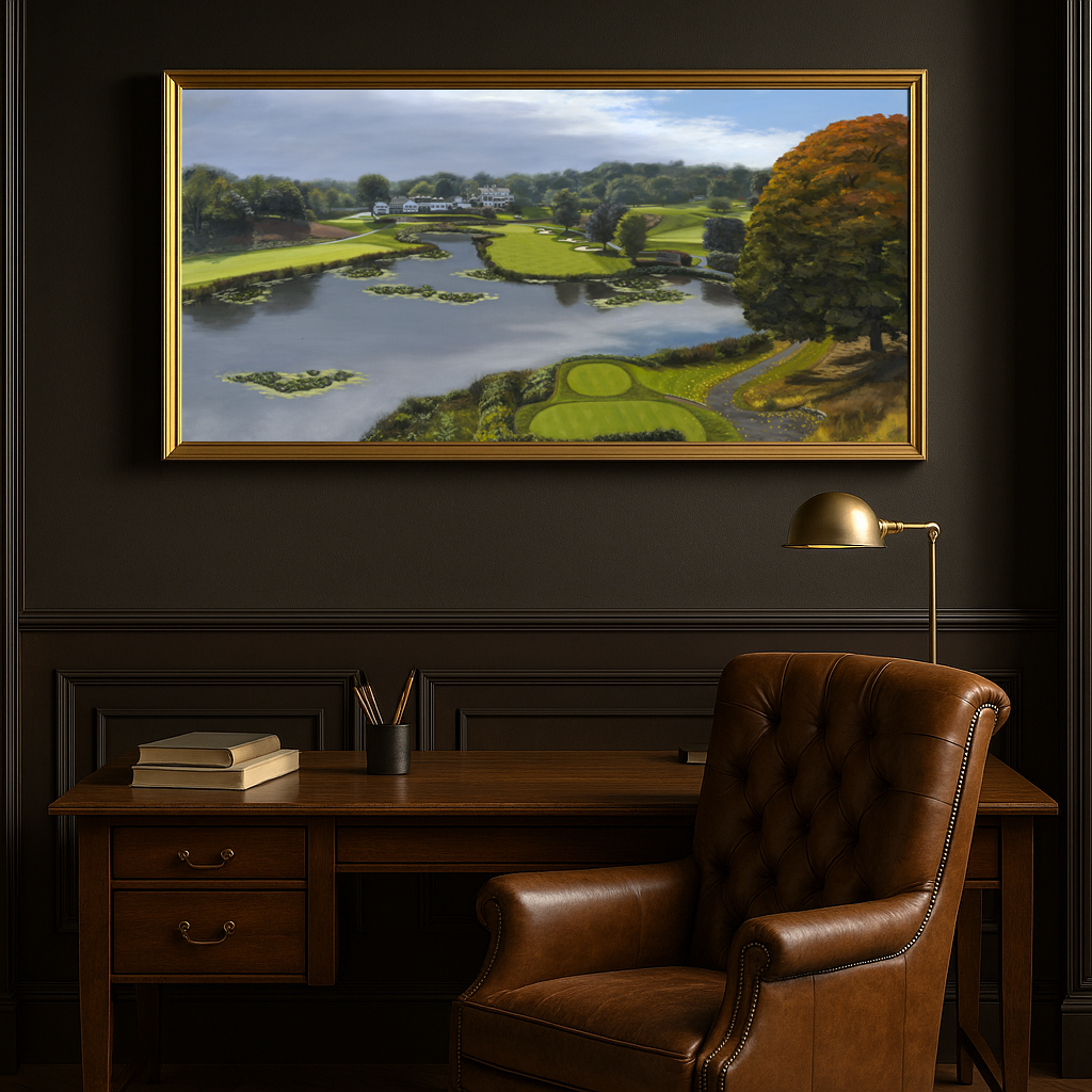 This original 24" x 48" oil on canvas captures the golden hues of fall at the prestigious Scarsdale Golf Club, established in 1898 in Westchester County, New York. Known for its classic parkland layout and rich golfing tradition, the club has long been a haven for golf lovers and art collectors alike.