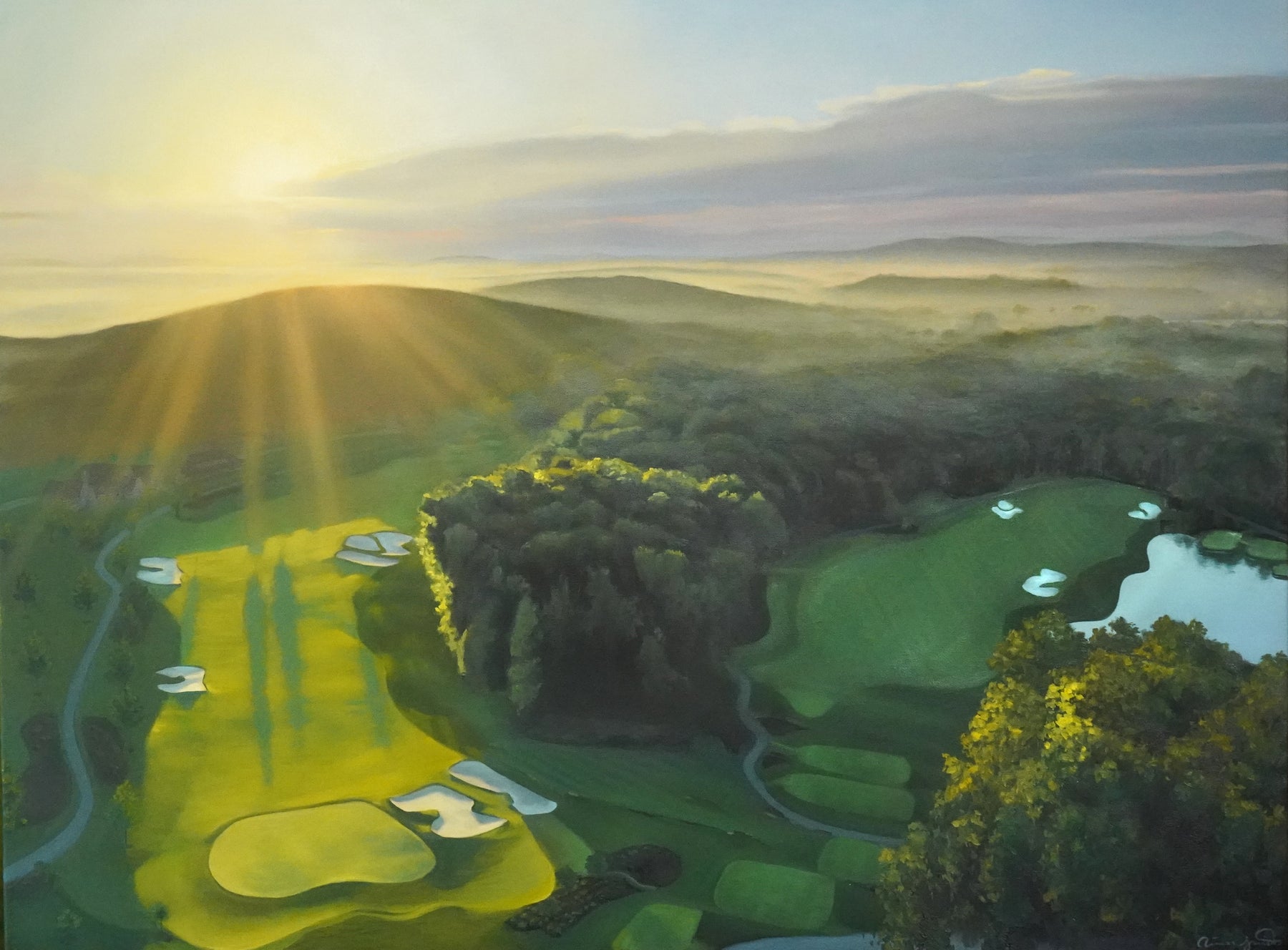 Tennessee mornings in the spring and summer are nothing short of magical. This painting showcases the first few minutes of morning sun with the hilltop fog at the first and last hole at Troubadour Golf and Field.