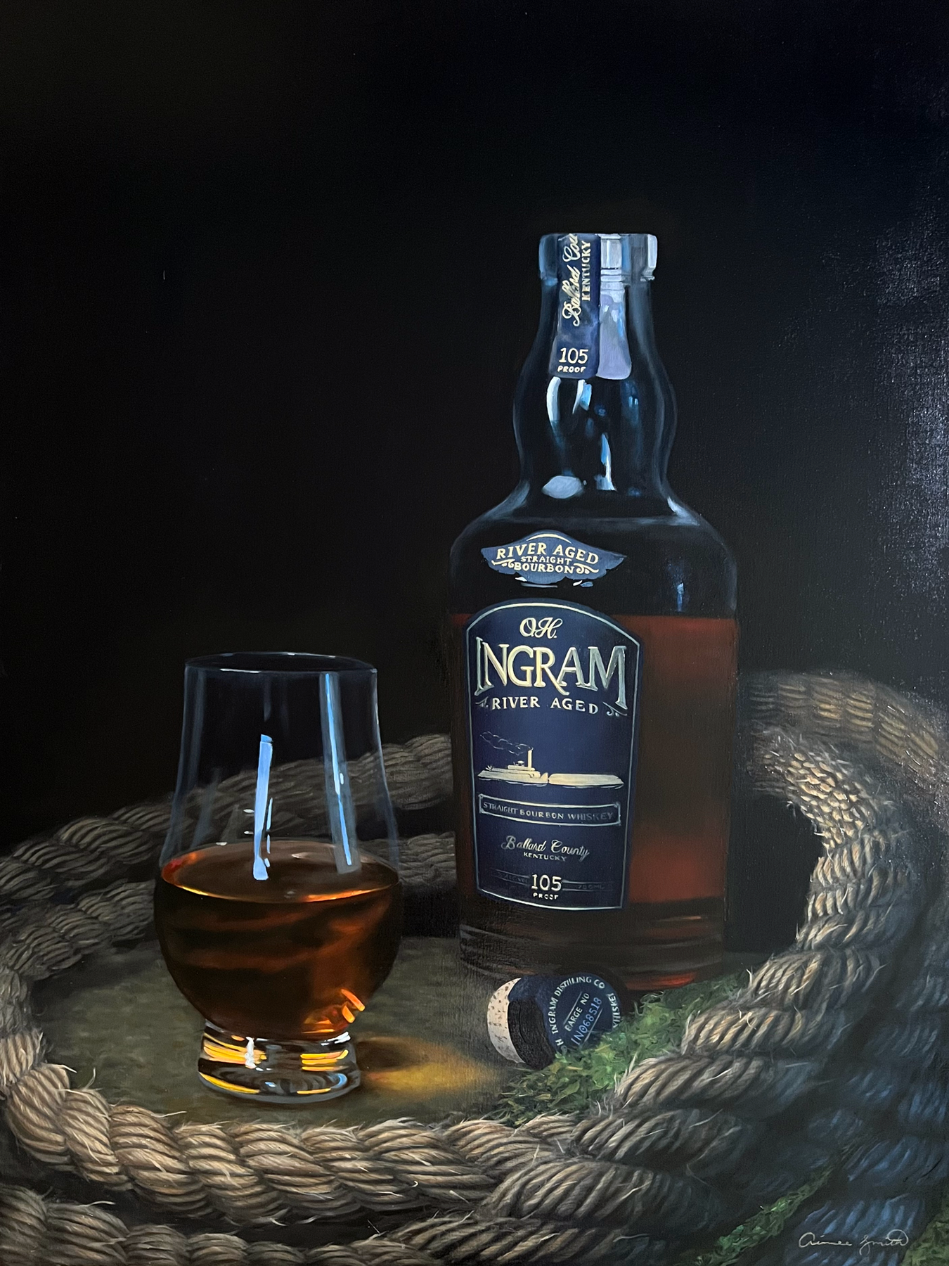 The first in the studio's whiskey series, "On the River" tells the story of O.H. Ingram, with subtle nods to the river with the rope and subtle moss.