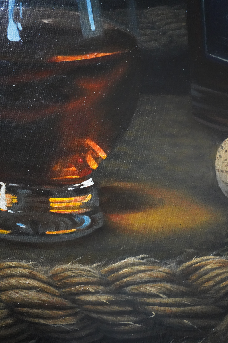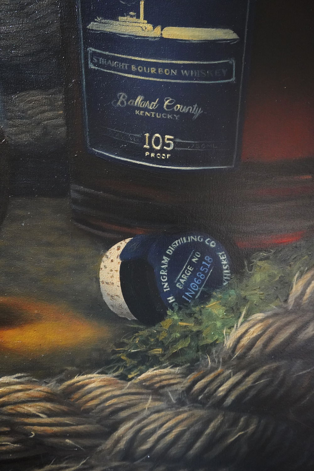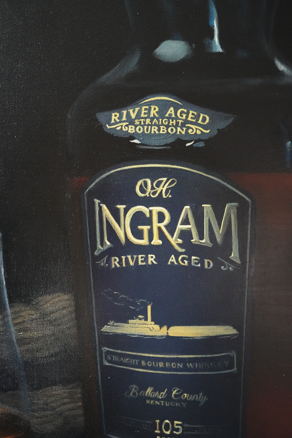 "On the River" Whiskey Still Life Painting, 36" x 48" oil on canvas