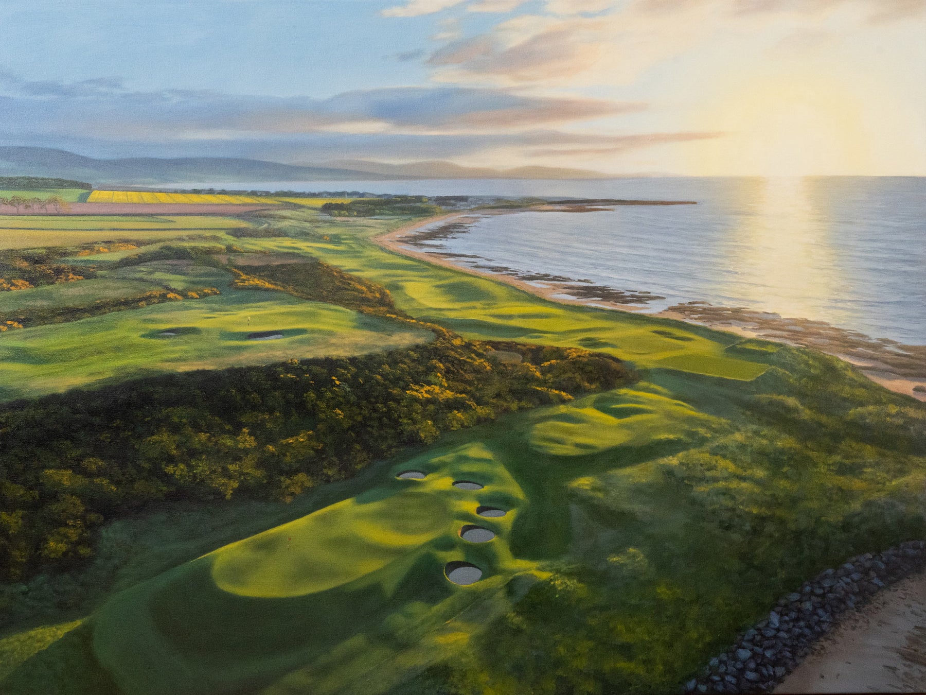 If you've ever played Royal Dornoch when the gorse is in bloom, you'll understand why so many golfers call this course their version of heaven. This painting features an encompassing view of the 10th hole in the foreground, 7th green, and 9th green neighboring the North Sea.