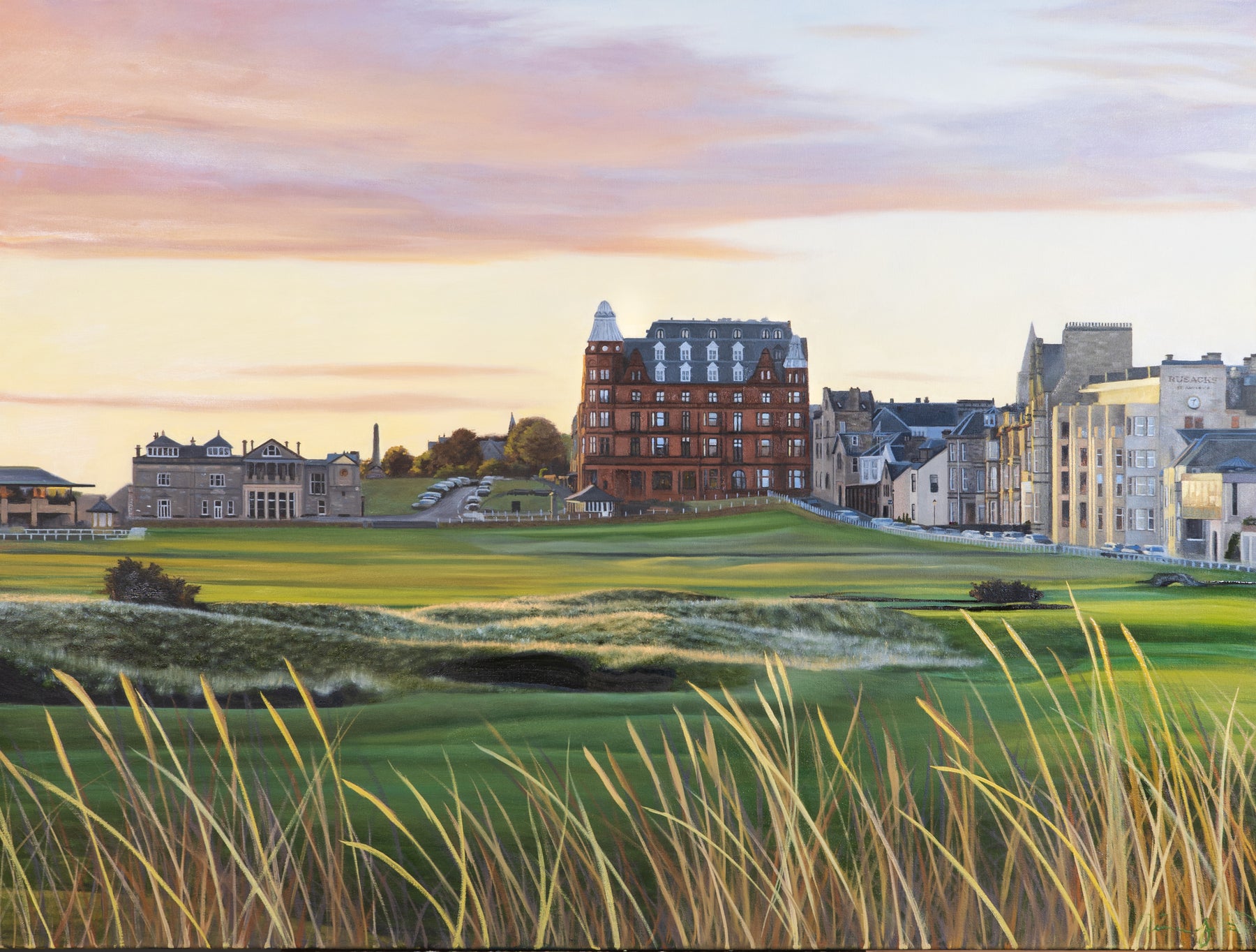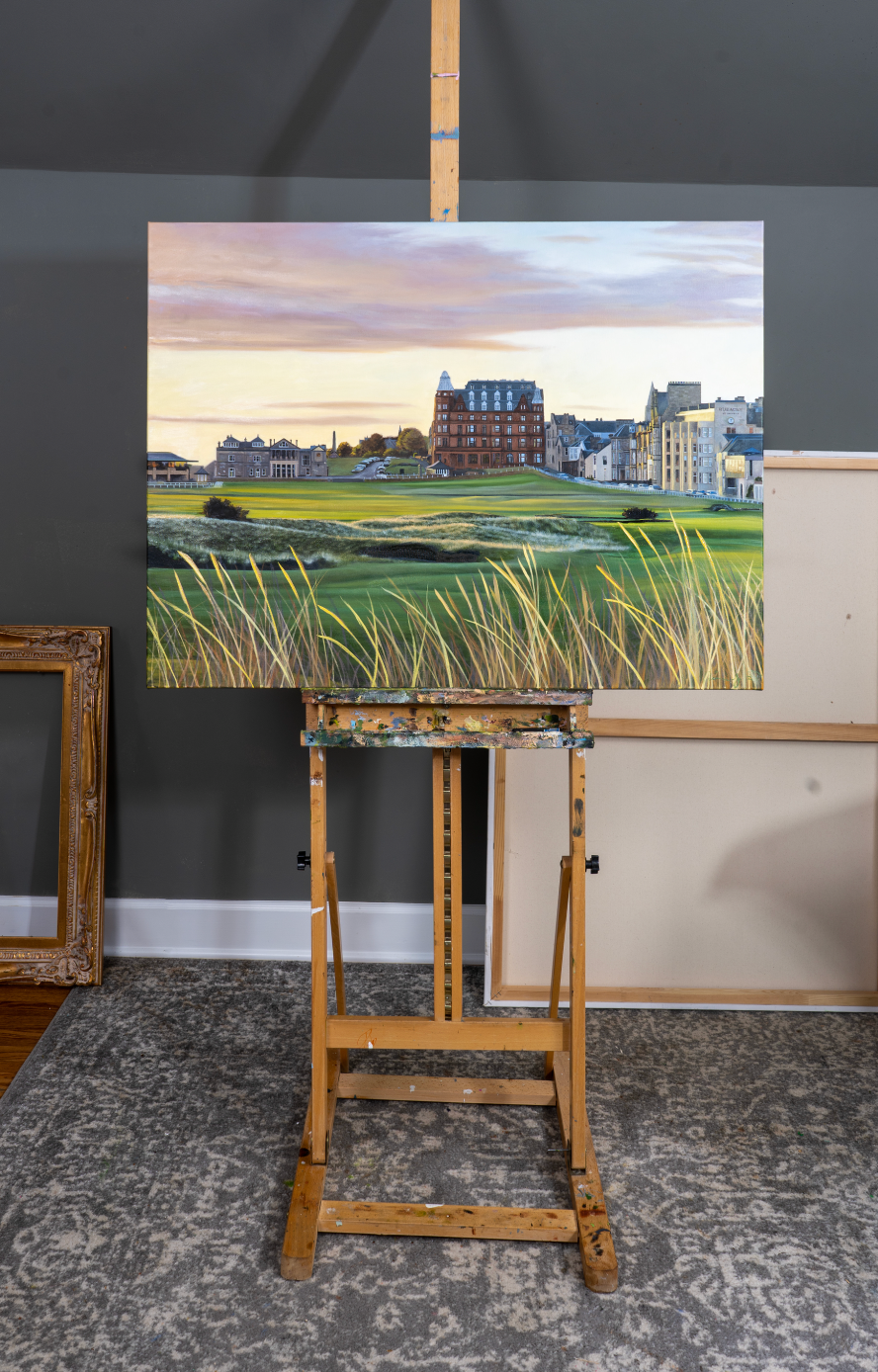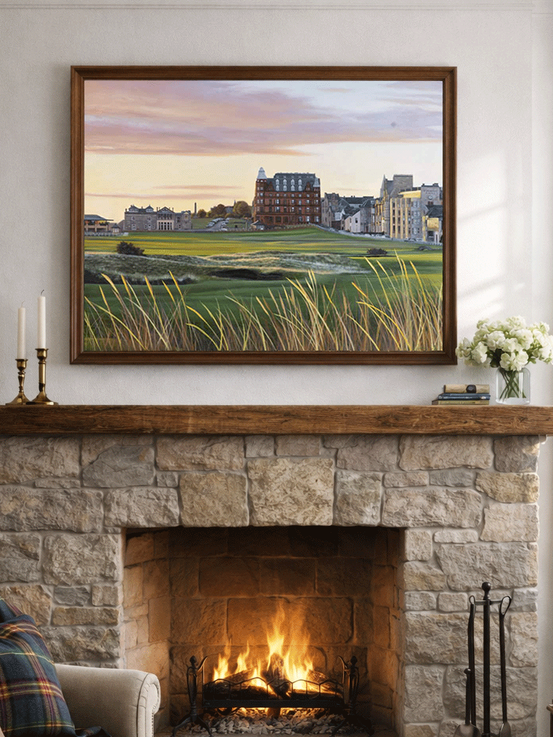 There's a special kind of magic in the air at the Old Course at St Andrews Links, and you can see it at sunrise at the 18th hole. This painting encompasses an early morning glimpse at the early golden hour.